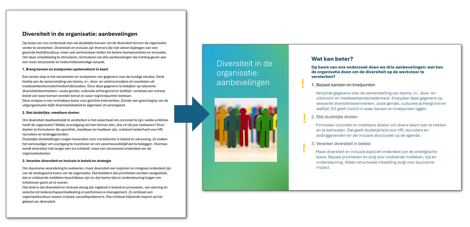Het zijn 5 K’s: korte tekst, kernboodschappen, kopjes, kolommen, kaders. Natuurlijk is het mooi als je daarnaast ook nog werkt aan sterke vormgeving en visuele ondersteuning (waarbij slimme AI-tools je veel werk uit handen kunnen nemen). Maar als alleen al die vijf K’s in orde zijn, is jouw powerpointrapport gegarandeerd al een stuk effectiever.